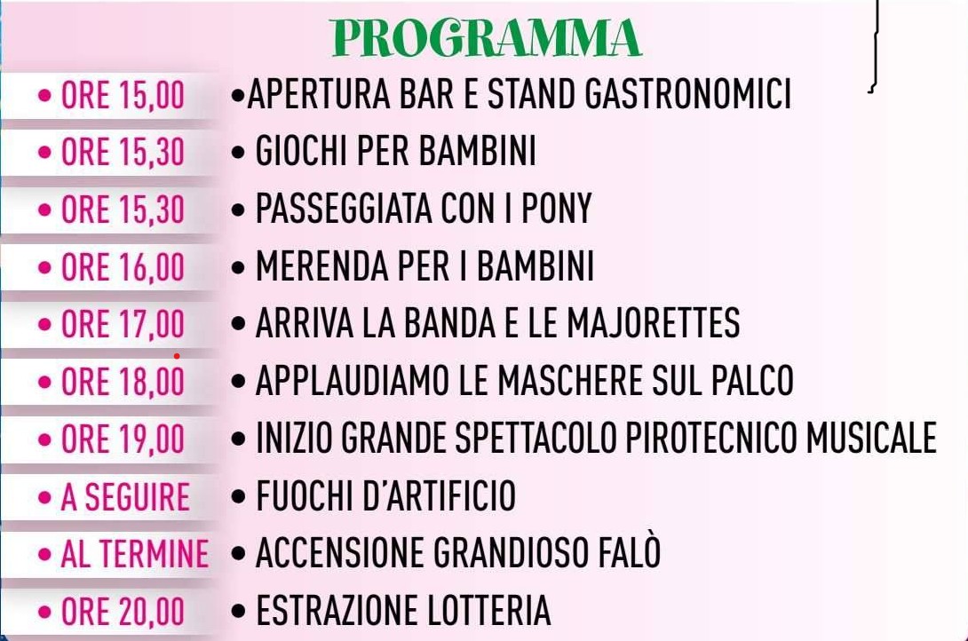 Giunto alla sua 34° edizione, mantiene vive le tradizioni antiche e promette un pomeriggio carico di divertimento a partire dalle 15, con il momento clou della manifestazione alle 19.30: il grande spettacolo pirotecnico musicale con fuochi d’artificio e, a seguire, l’accensione del tradizionale falò con la Poiana.