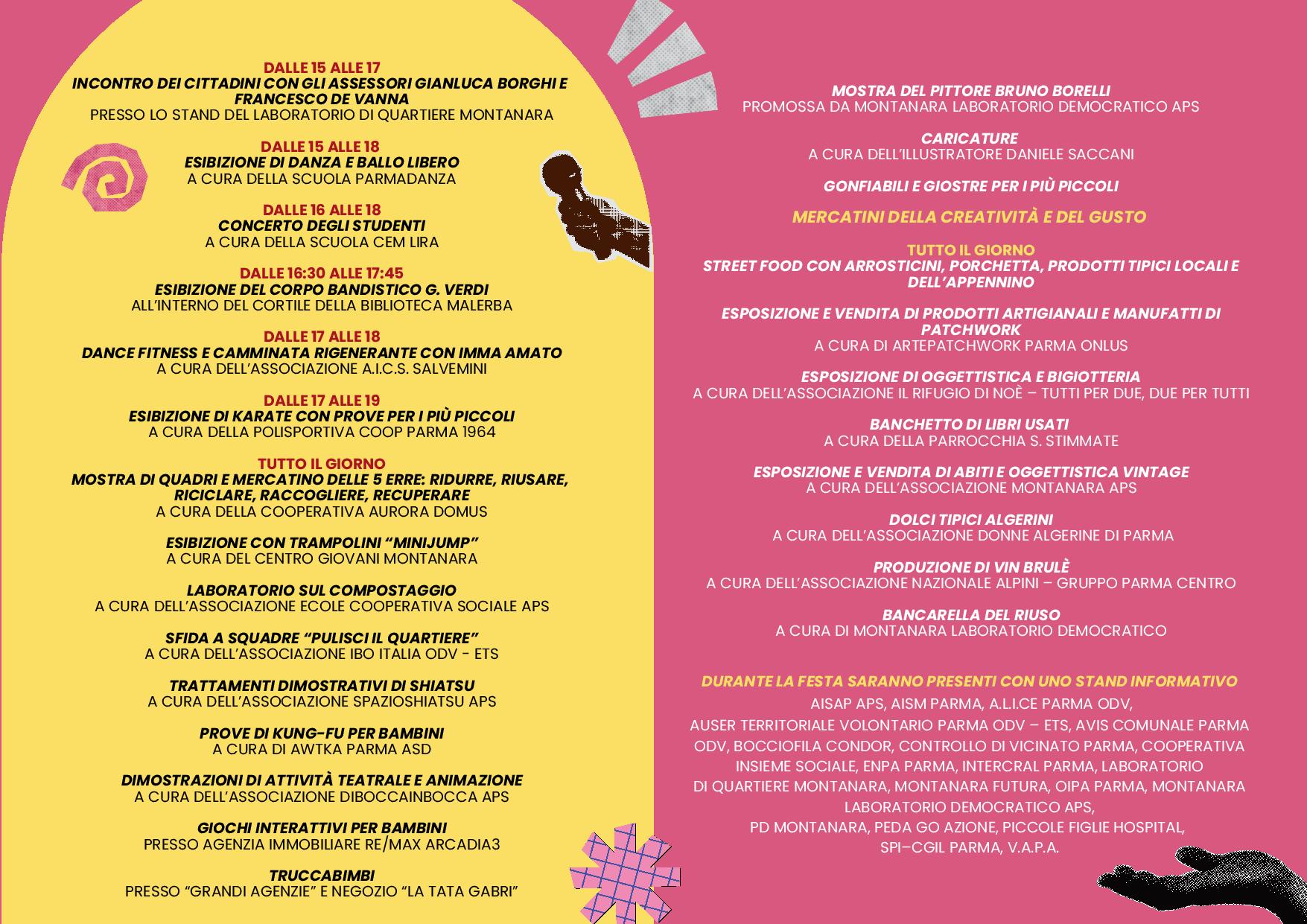 La festa è promossa dalle associazioni Montanara Insieme e Montanara Laboratorio Democratico e organizzata da Edicta con il patrocinio dell’Assessorato alla Partecipazione, all’Associazionismo e ai Quartieri del Comune di Parma e con il contributo della Fondazione Cariparma.