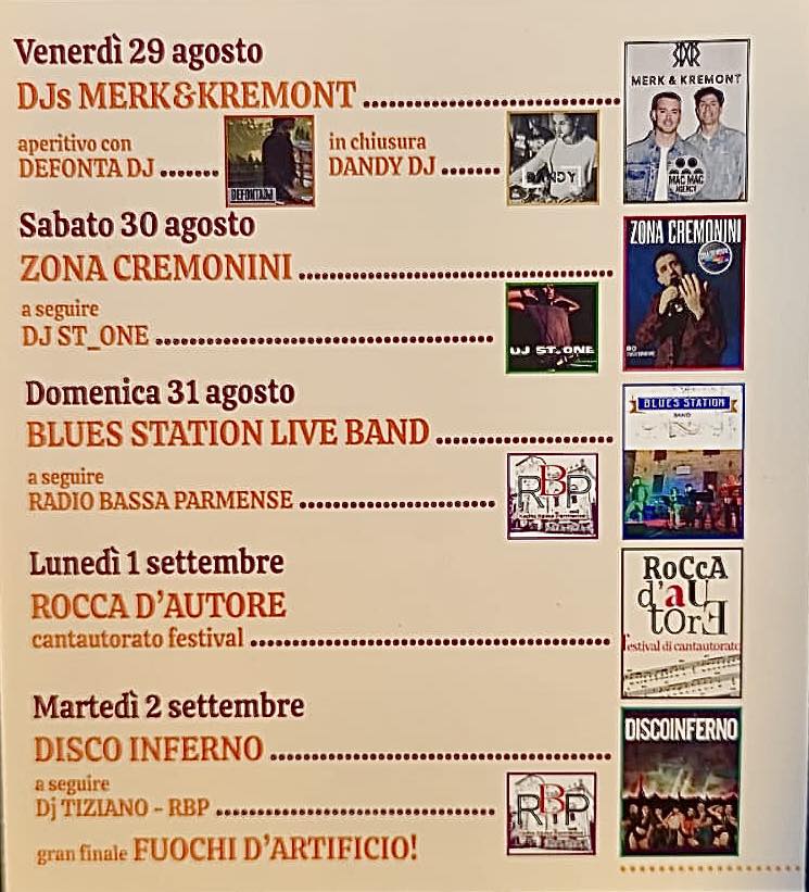 La Fiera verrà inaugurata venerdì 29 agosto alle ore 19 con l'apertura del tradizionale Luna Park che accoglierà grandi e piccini con le sue colorate e divertenti attrazioni. Numerosi saranno i punti ristoro allestiti e le occasioni per degustare due grandi eccellenze del territorio come la Spalla Cotta di San Secondo e il vino Fortanina, insieme ad una ricca scelta di piatti della cucina tradizionale locale. Non mancheranno servizio bar, cocktail e aperitivi. Ricco il programma musicale, con concerti dal vivo ed esibizioni di boogie woogie, cantautorato, rock, blues, numerosi dj-set per animare il "dopo cena" e un tributo a Cesare Cremonini per ripercorrere tutti i grandi brani dell'artista bolognese.