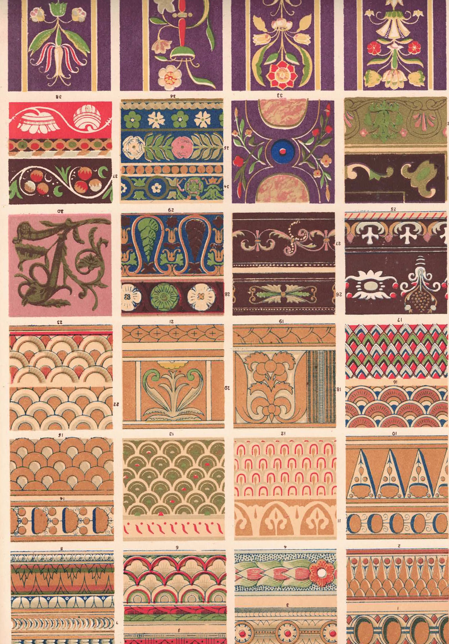 Pubblicato nel 1856, The Grammar of Ornament è ancora oggi considerato un volume fondamentale per lo studio del design. Il suo autore, Owen Jones, ideò un trattato completo sul design per l'era industriale arricchito da splendide illustrazioni a colori realizzate con la cromolitografia.